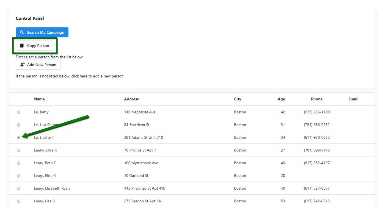 The first thing you will want to do is search and see if they are in the My Voters database. If they are, you can avoid typing all their info into MyCampaign by simply copying their information over. If they are not in MyVoters, you will need to Add a New Person and fill in their info.