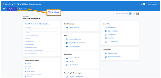 When you first log into the VAN, you will most likely be on the My Voters page. To access MyCampaign, simply click on the tan tab to the right of My Voters. You will notice the MyCampaign page looks very similar to My Voters.